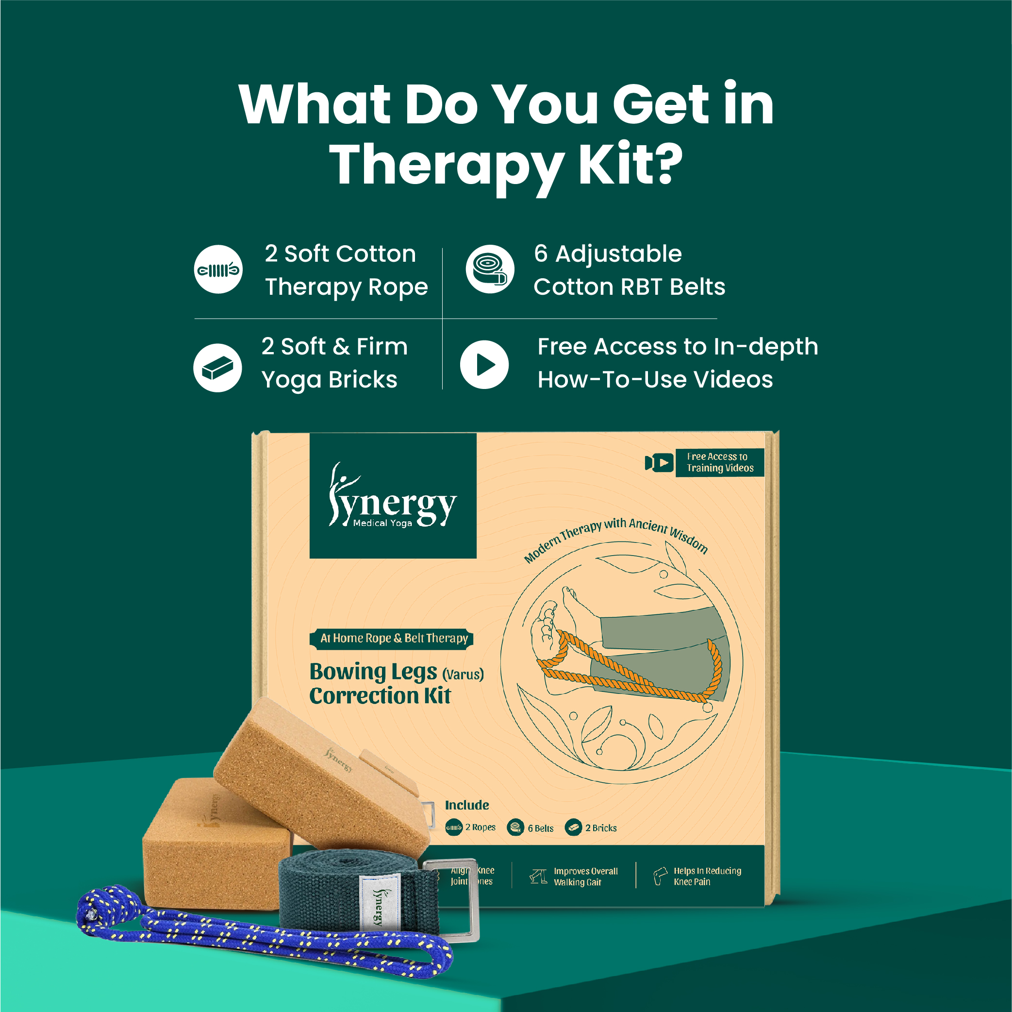 Bowing Legs (Varus) Correction Kit provides a specialized rope & belt therapy solution, featuring 6 belts, 2 ropes, and 2 bricks to aid in effective alignment and correction of